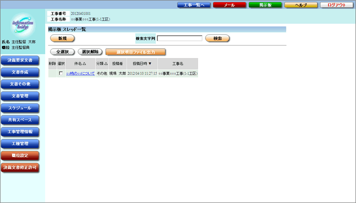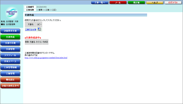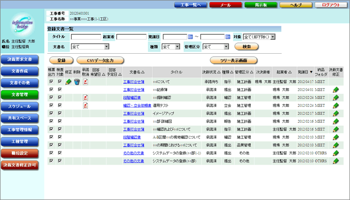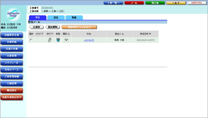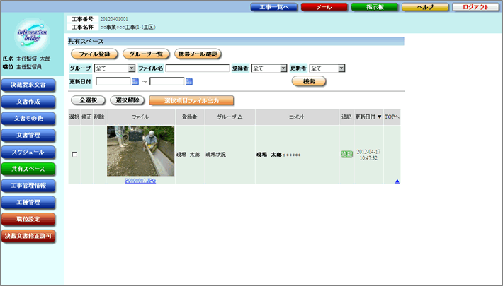 工事関係者間で写真データや文書データを共有することができます。携帯電話のメール機能からファイルを登録することもできます。