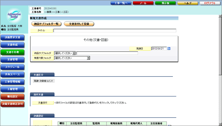 その他の文書が発議できます。その他の文書では、添付ファイルの格納先として、納品サブフォルダと検査フォルダを指定して登録できます。