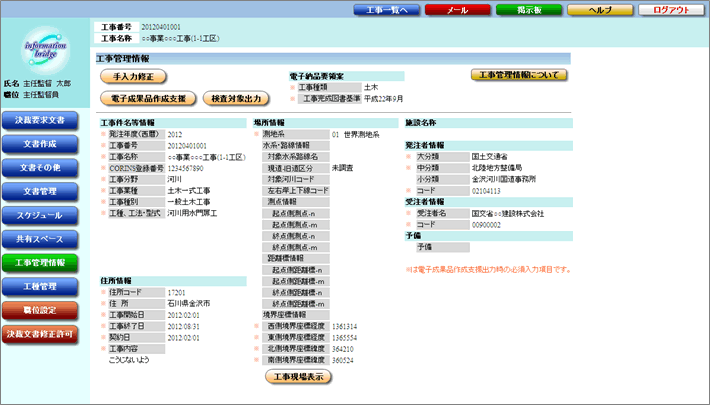 工事管理情報では、工事管理のXMLに記載する内容の修正および電子納品成果データ(検査対象データ)の作成ができます。